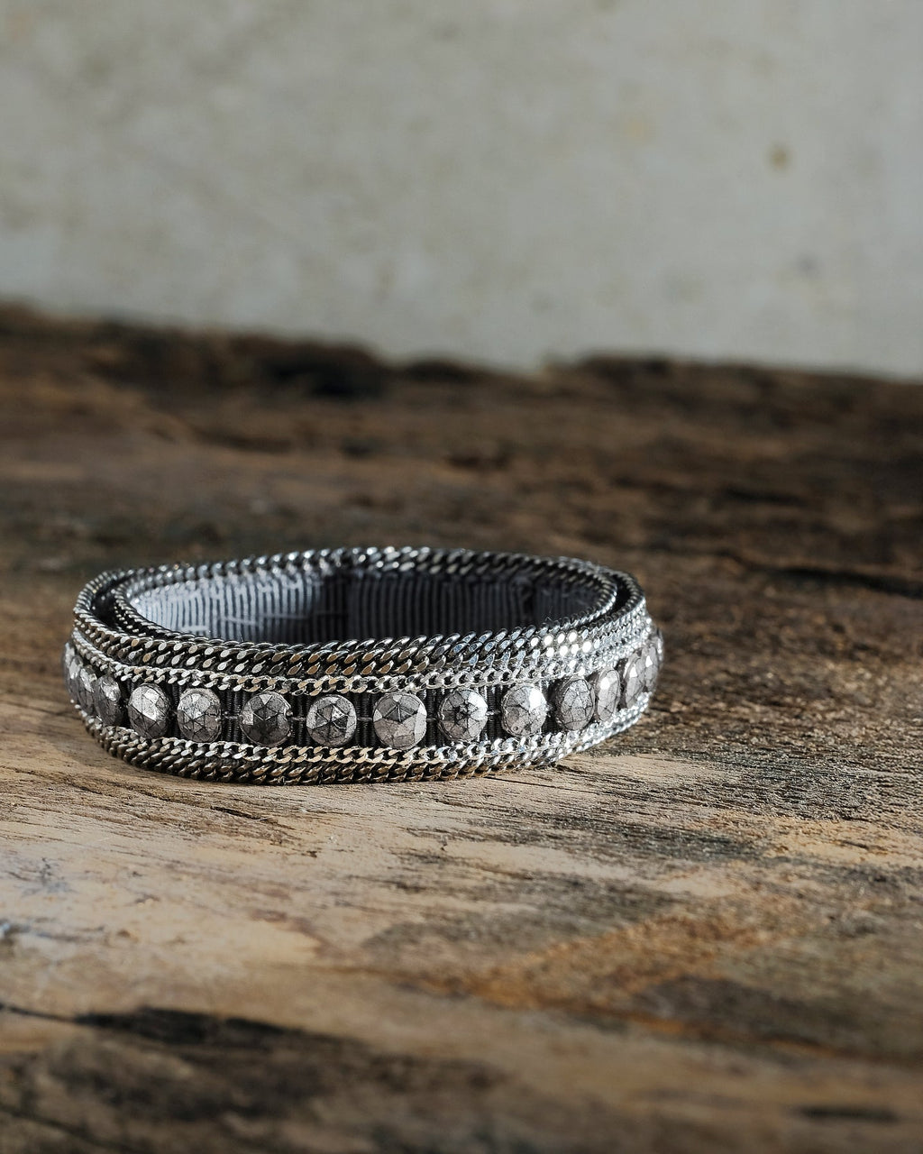 Double-wrap bracelet crafted from a dark grey grosgrain ribbon, delicately embroidered with brass chains in a ruthenium finish. A row of vintage crystal beads with chromed reflection completes the elegant design of the bracele, which can also be worn as a choker.