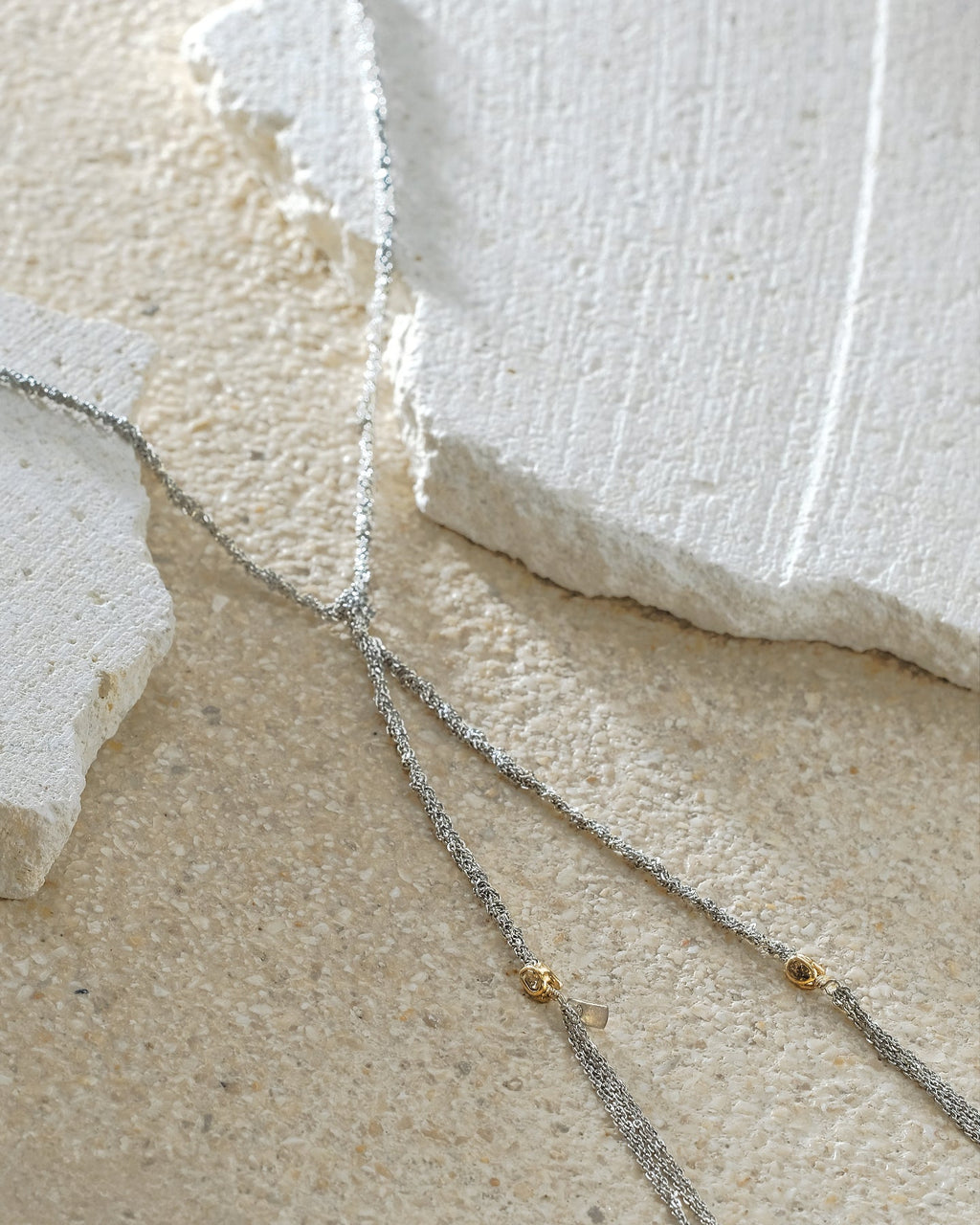 Lariat necklace in 925 Sterling silver with a rhodium finish, composed of a delicate braid of chains. Each end is adorned with a soft chain tassel and a faceted bead set with Polki diamonds.
