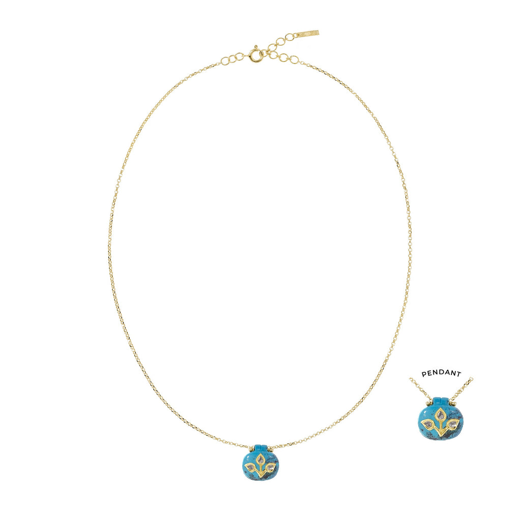 Necklace in 925 sterling silver with a gold finish, featuring a round-link chain and a pebble-shaped Chrysocolla pendant. The pendant is inlaid with a finely chased floral motif set with diamonds, highlighting the raw and natural beauty of the stone.