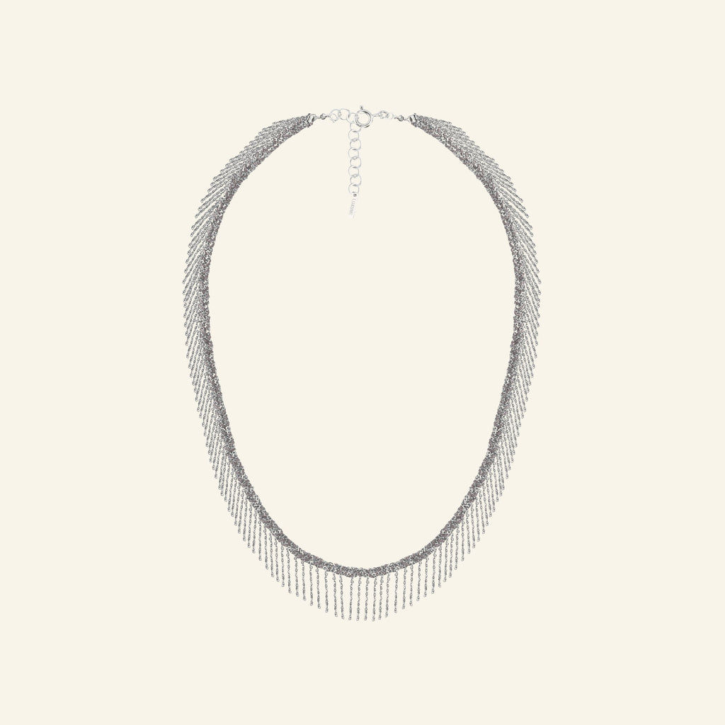 Short multi-strand fringe necklace in sterling silver chain braided with grey silk yarn.