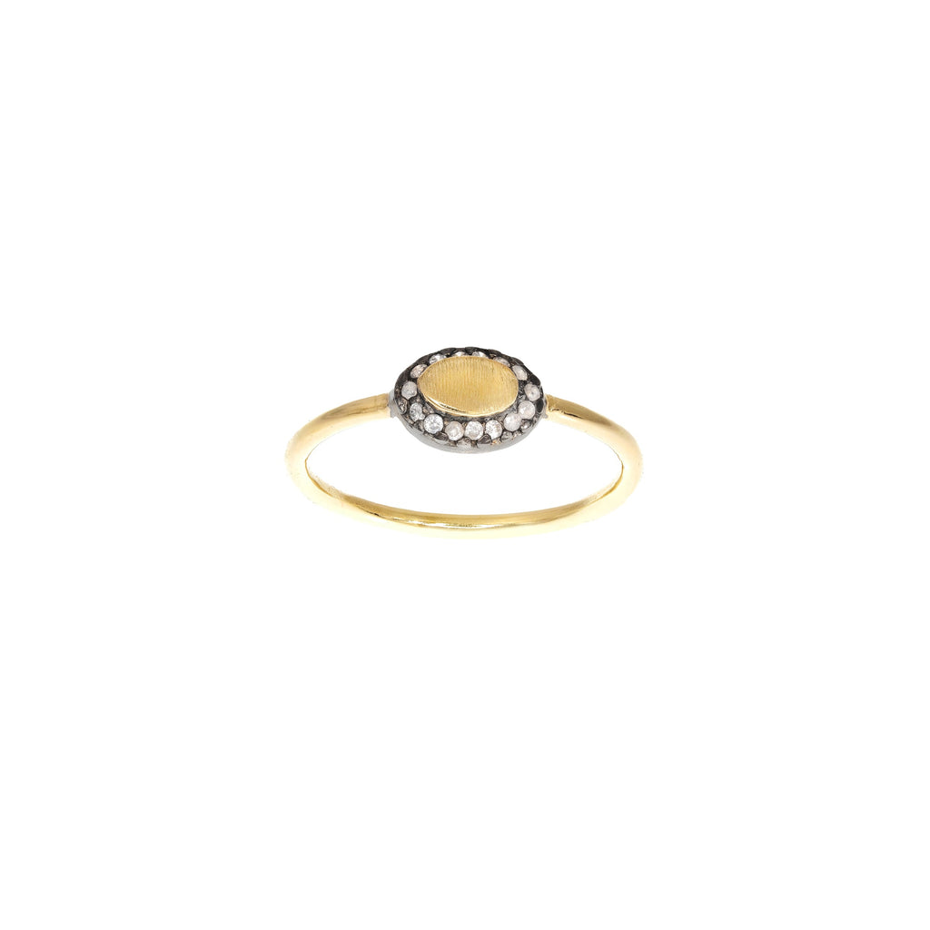 Bague en argent 925 doré composée d'un médaillon serti de mini diamants irréguliers et d'une pierre en argent, réhaussée d'une dorure satinée.
