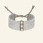 Bracelet manchette tissé en argent 925 composé de fines chaines à la finition ruthénium et de fils de soie noirs. Il est agrémenté de trois médaillons sertis de mini diamants irréguliers et de pierres en argent, rehaussées d'une dorure satinée.