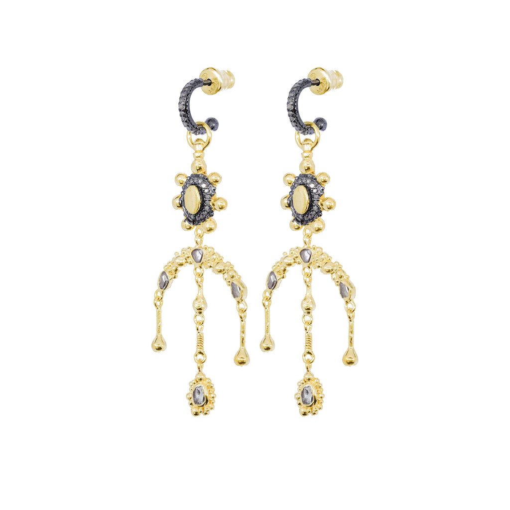 Paire de boucles d’oreilles en argent 925 doré, composée d’arceaux mobiles suspendus à des médaillons ornés de pierres en argent doré et décorés de motifs ronds dorés et ruthéniés. L’ensemble, serti de diamants Polki et de mini diamants, est monté sur des demi-créoles pavée de diamants.