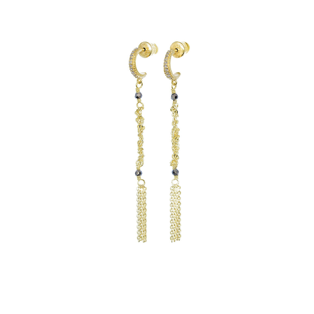 Paire de boucles d'oreilles en argent 925 doré, composée de tressages de chaînes ornés de perles de cristal et de pompons de chaînettes. L'ensemble est monté sur des demi-créoles pavées de mini diamants.