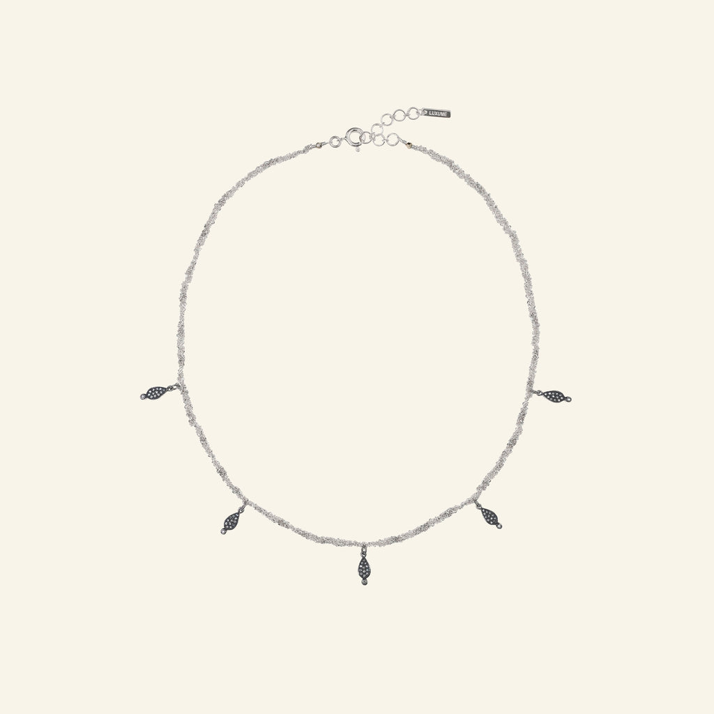 Collier court en argent 925 composé de chaines tressées et orné de cinq pendentifs en forme de goutte en argent oxydé, pavés de mini diamants irréguliers.