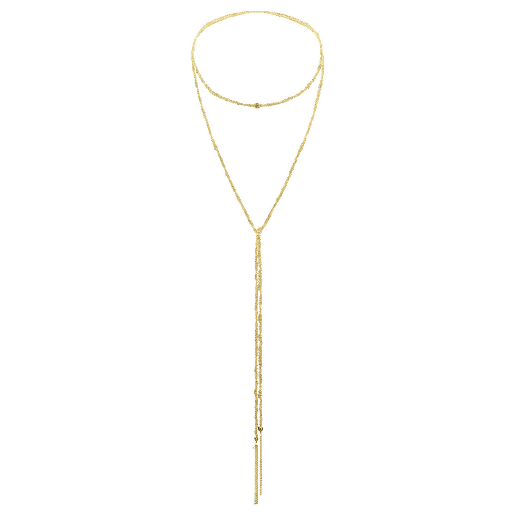 Collier écharpe en argent 925 doré, composé d’un délicat tressage de chaînes. Des perles facettées serties de diamants Polki et des pompons de chaînettes aux extrémités apportent une touche élégante et lumineuse.
