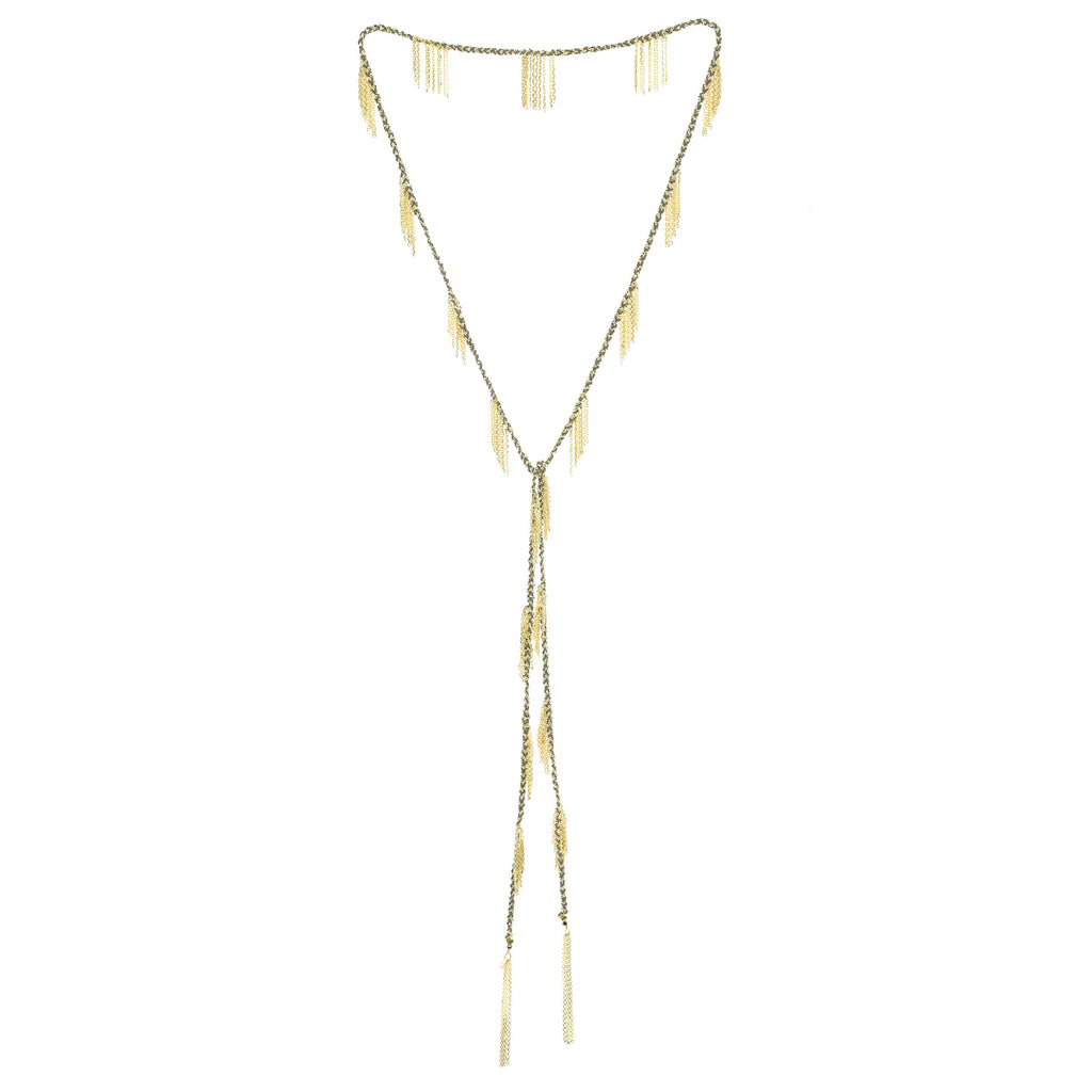 Collier tressé composé de plusieurs fines chaînes en Argent 925 doré et de fils de soie gris. De multiples franges de 1,5 cm sont disposées régulièrement tous les 3 cm autour du collier.