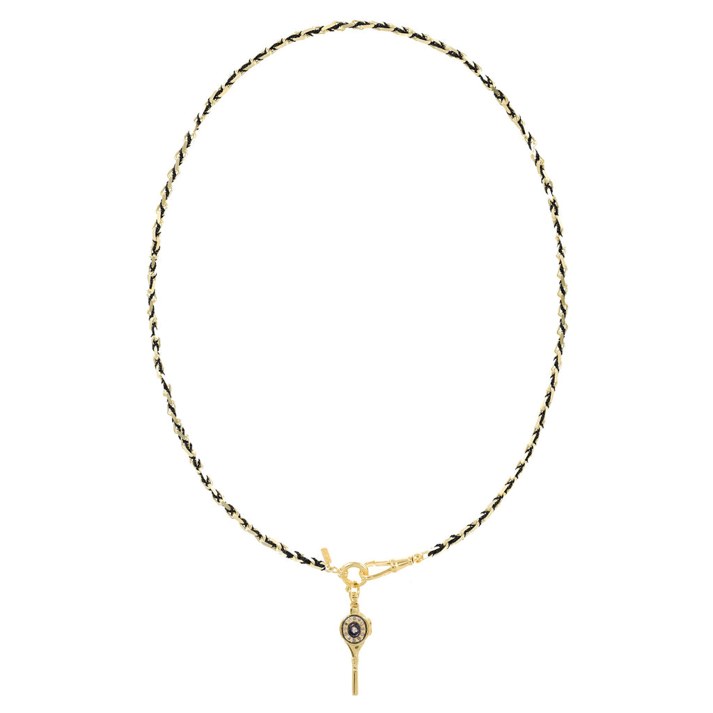 Collier en argent 925 doré, composé d'une chaine à larges maillons entièrement rebrodée de fils de nylon soyeux noirs. Il est agrémenté d'un pendentif amovible, inspiré des clés de montre ancienne, serti d'un diamant Polki et de mini diamants.