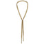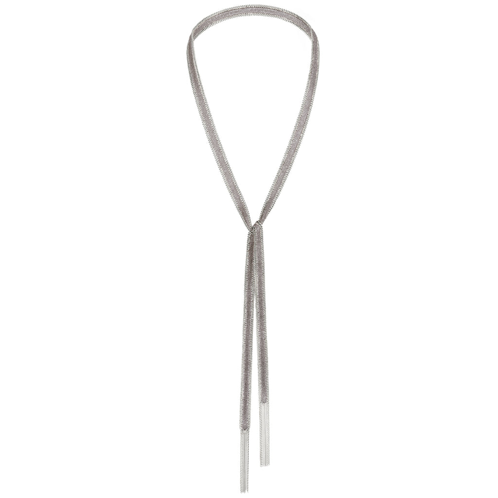 Collier écharpe composé d'un ruban en satin métallisé gris foncé, délicatement rebrodé de chaînes en laiton à la finition bronze blanc. Des pompons de chaînes ornent chaque extrémité, complétant le design de ce collier qui peut se porter noué sur le devant ou enroulé autour du cou.