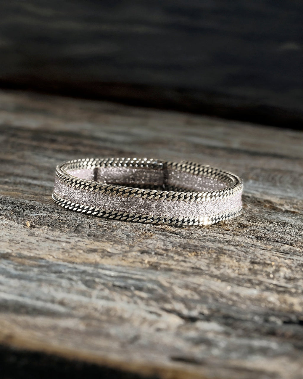 Bracelet double tour composé d'un ruban en satin métallisé gris foncé, délicatement rebrodé de chaînes en laiton à la finition bronze blanc, de chaque côté