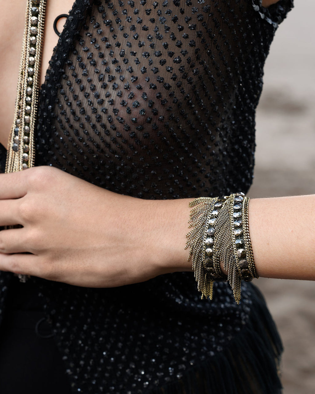 Bracelet double tour composé d'un ruban grosgrain de couleur kaki, délicatement rebrodé de chaînes en laiton à la finition or vieilli. Une rangée de perles de cristal anciennes aux reflets chromés et une frange de chaines complètent le design de ce bijou qui peut éventuellement être porté en ras-du-cou.