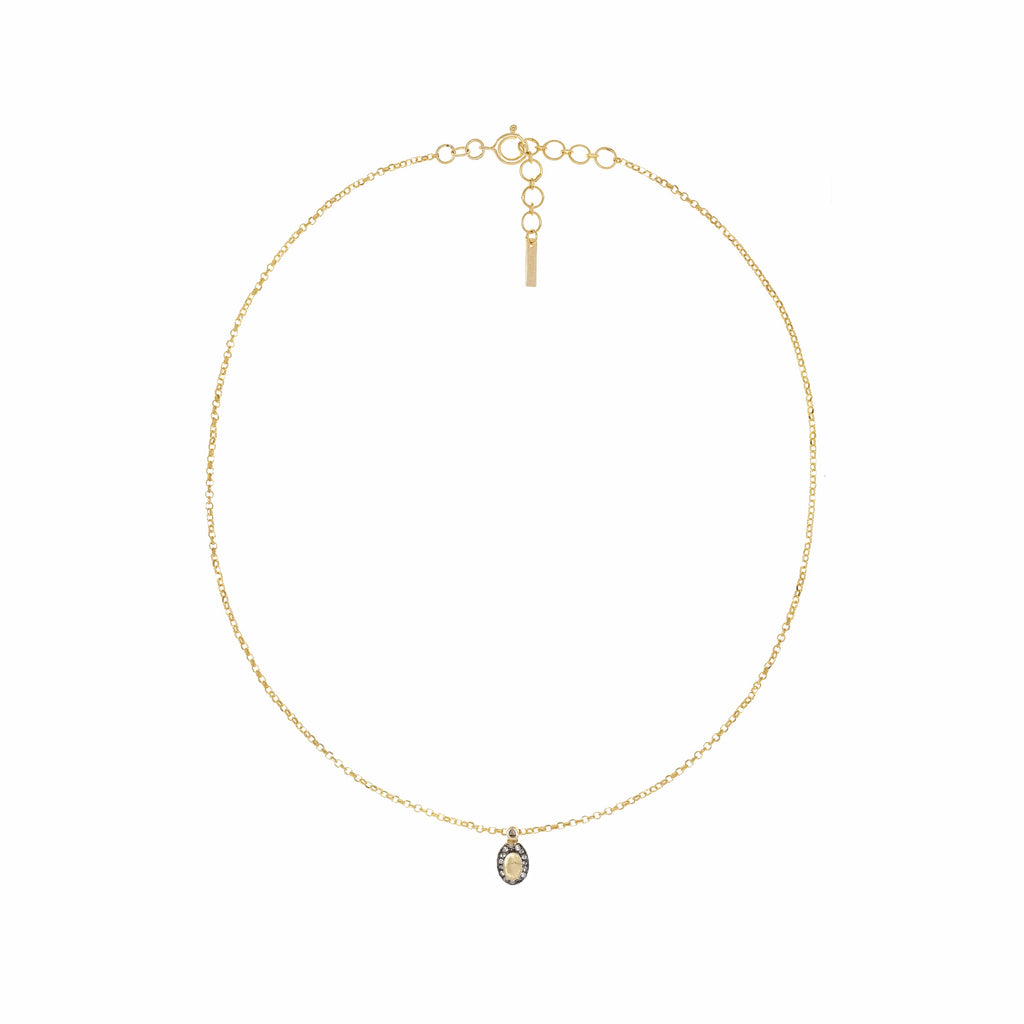 Collier court en argent 925, composé d'une chaine dorée à maillons ronds. Il est doté d'un médaillon serti de mini diamants irréguliers et d'une pierre en argent, réhaussée d'une dorure satinée. La bélière ornée d'un diamant Polki, sublime le délicat motif du pendentif.