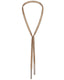 Long scarf necklace made from a taupe-colored metallic satin ribbon, finely embroidered with brass chains in a ruthenium finish. Chain tassels at each end complete the elegant design of the necklace that can be knotted at the front or wrapped around the neck.