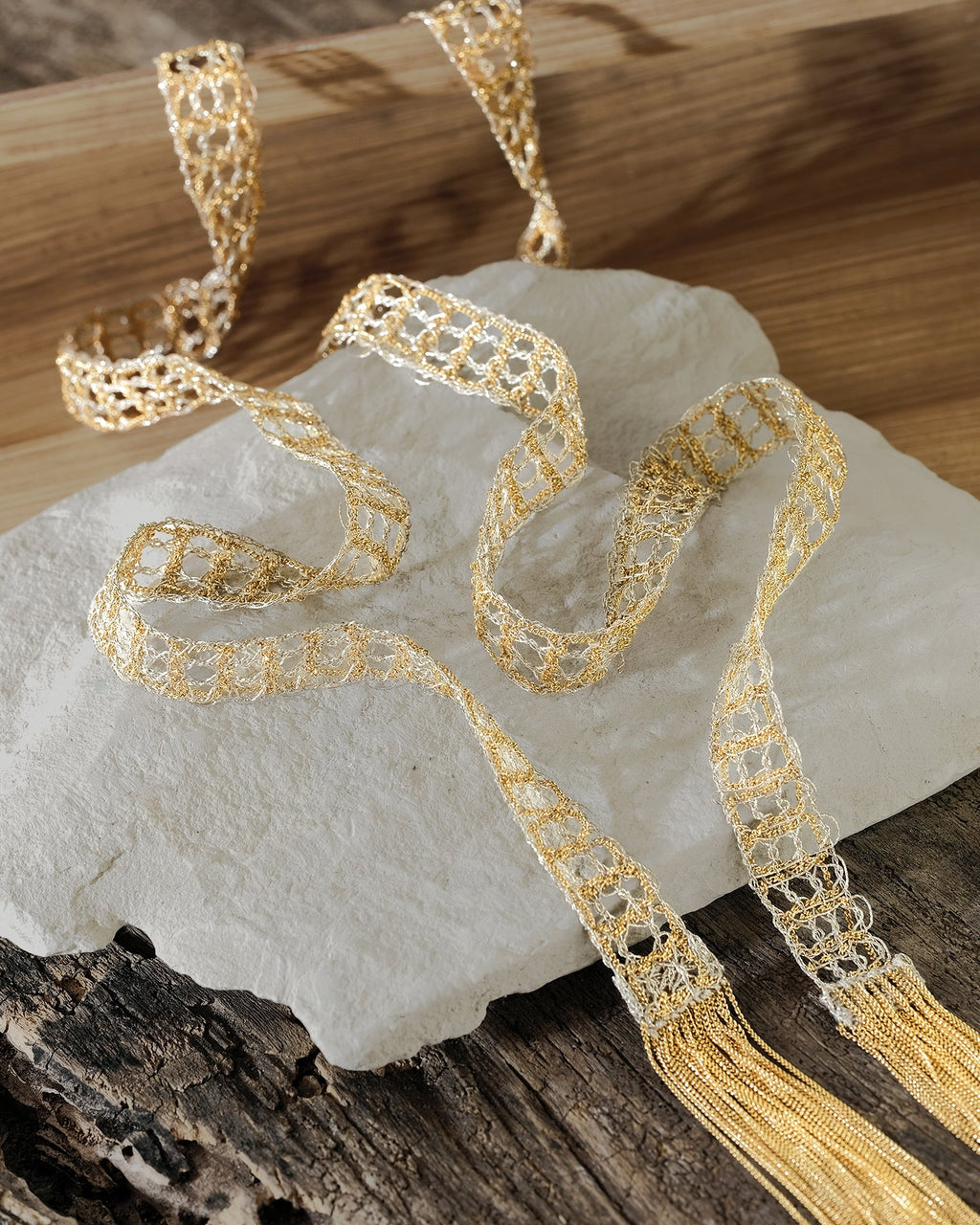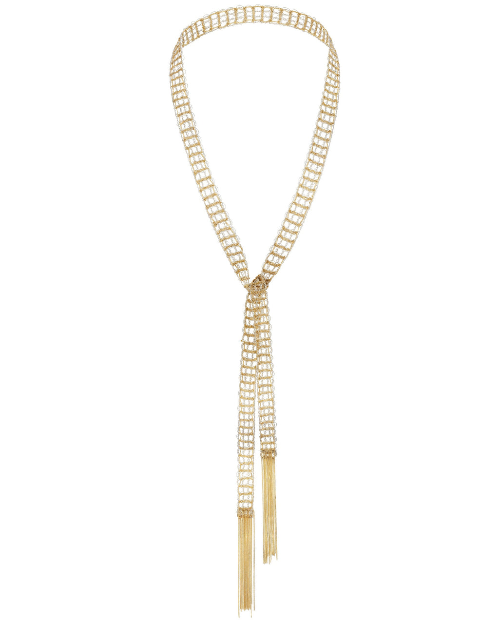 Long scarf necklace crafted from an antique silver Lurex lace ribbon, delicately embroidered with brass chains in a gold finish. Chain tassels at each end complete the elegant design of the necklace that can be knotted at the front or wrapped around the neck.