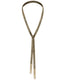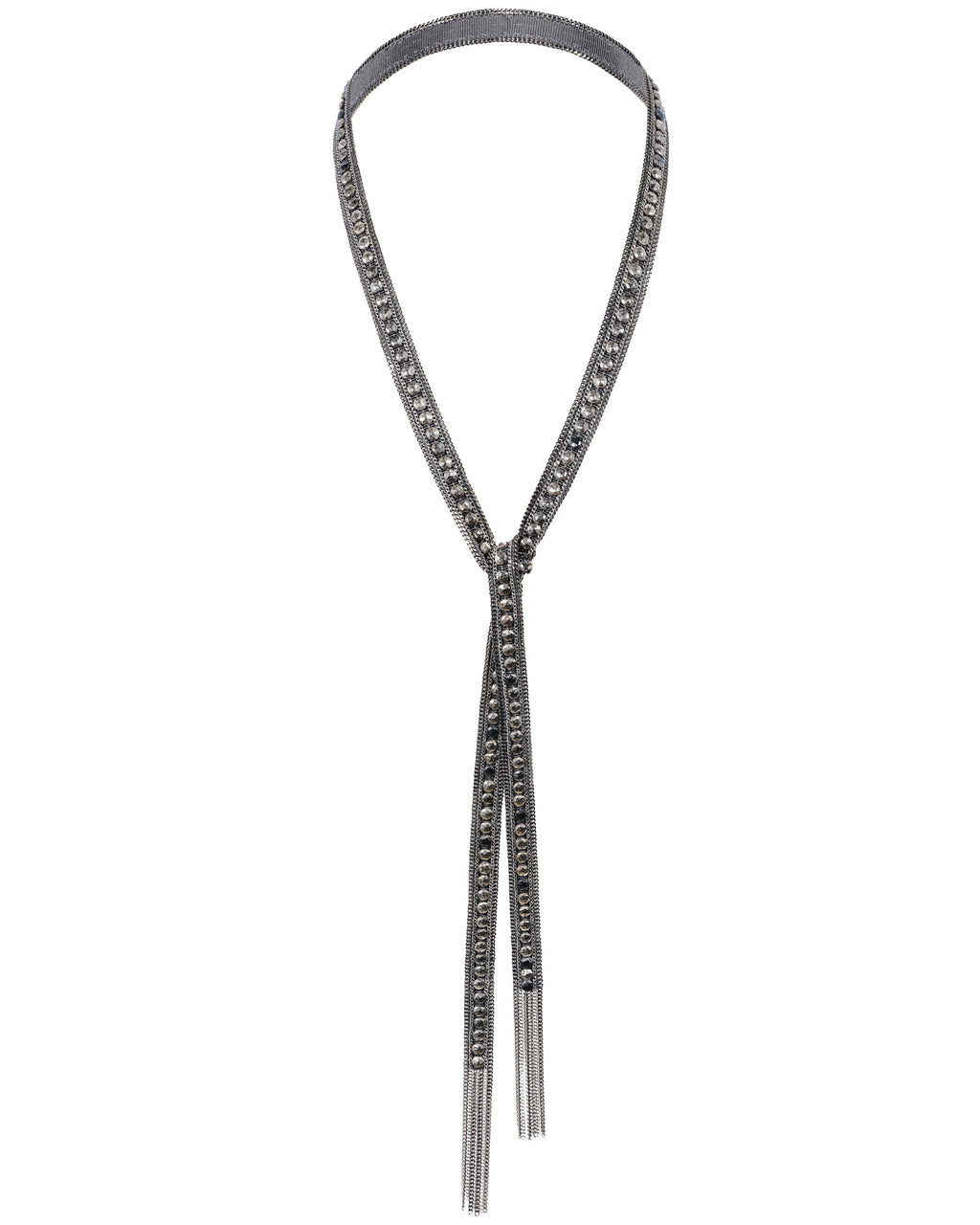 Long scarf necklace crafted from a dark grey grosgrain ribbon, delicately embroidered with brass chains in a ruthenium finish. A row of vintage crystal beads with chromed reflection, along with chain tassels at each end, complete the elegant design of the necklace that can be knotted at the front or wrapped around the neck.