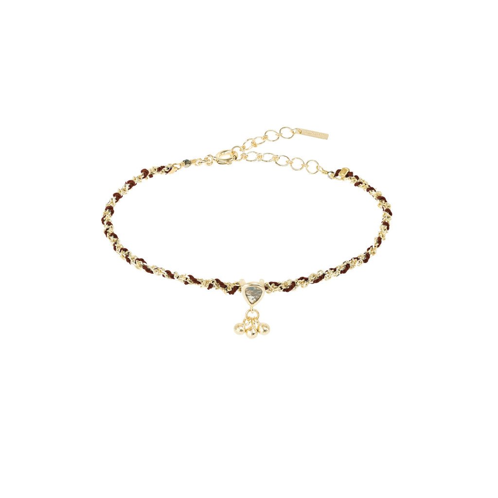 Braided bracelet made of gold-finished fine 925 Sterling silver chain and brown silk yarn. A tiny pendant adorned with a Polki diamond and three dangling mini bells completes the bracelet.