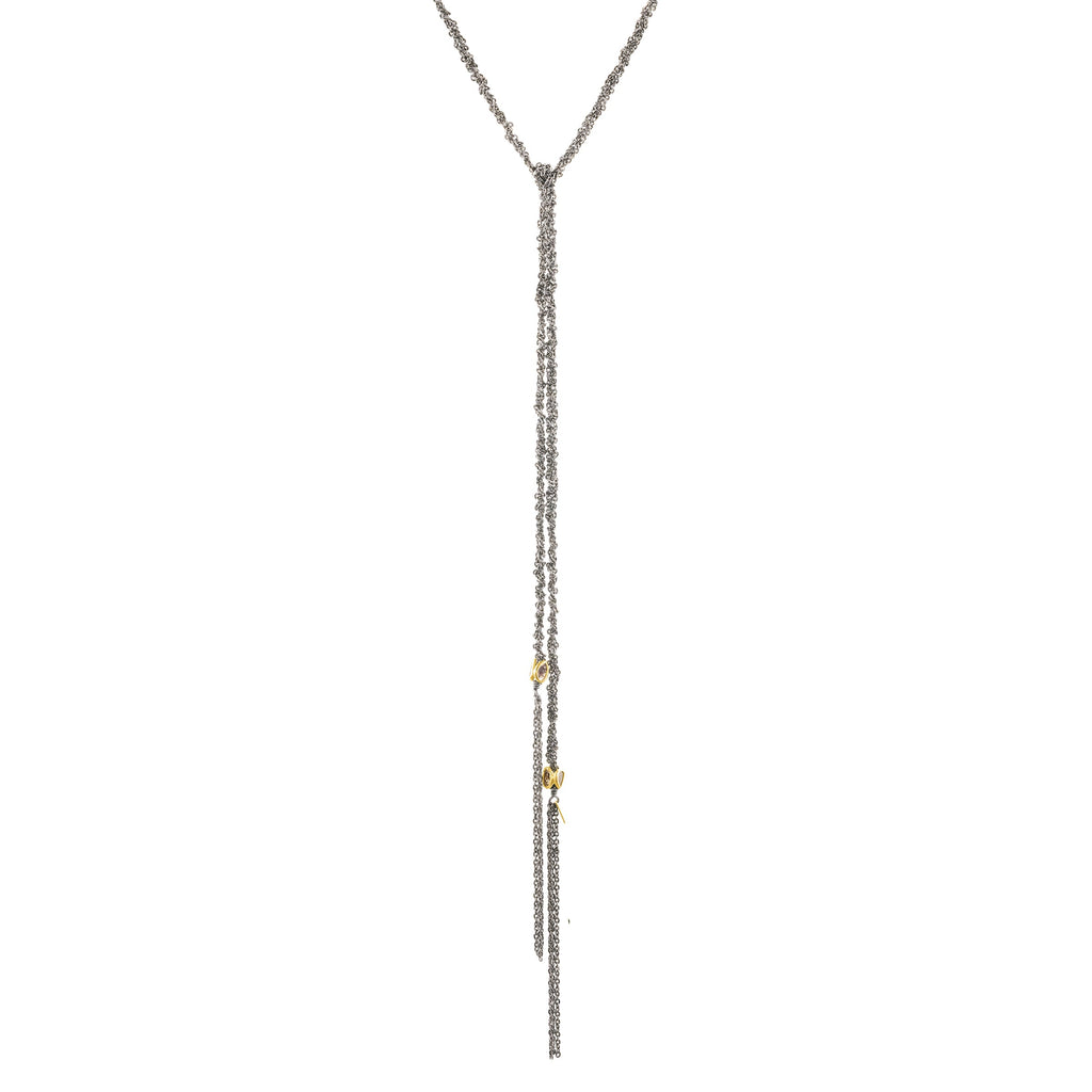 Lariat necklace in 925 Sterling silver with a ruthenium finish, composed of a delicate braid of chains. Each end is adorned with a soft chain tassel and a faceted bead set with Polki diamonds.