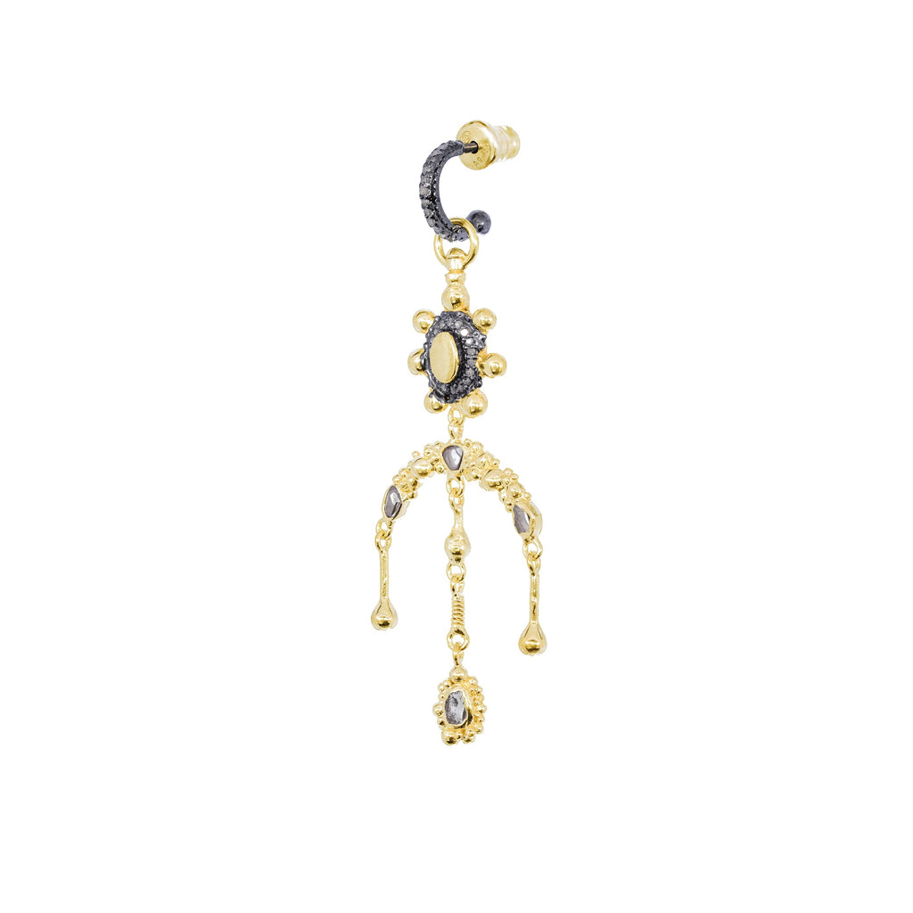 Earring in 925 Sterling silver with a gold finish, featuring a pendant composed of an arch and a medallion embellished with a solid silver stone and round motifs in gold and ruthenium finishes. The pendant is accented with Polki diamonds and mini diamonds, and mounted on a half-hoop pavé-set with diamonds.
