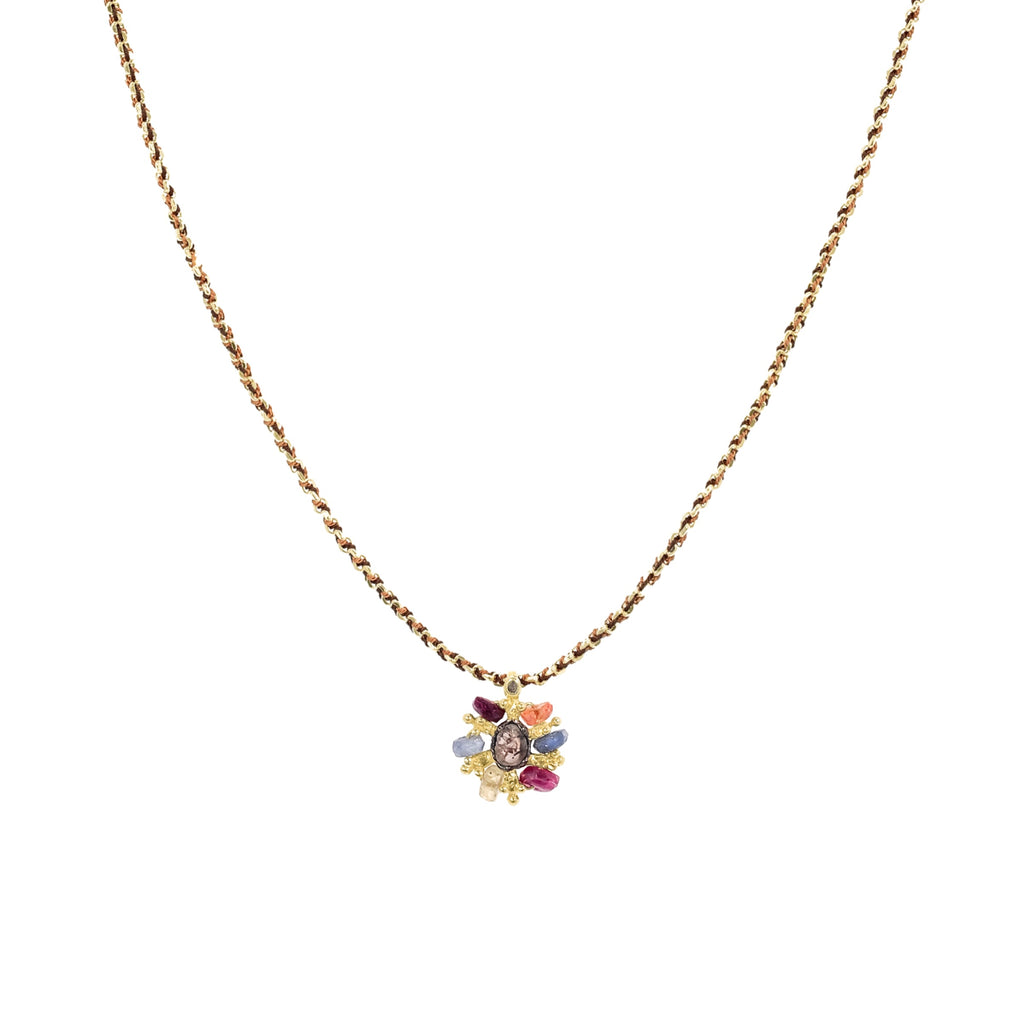 Necklace in 925 Sterling silver with a gold finish, featuring a chain, entirely hand-embroidered with brown and caramel silk yarns. It is adorned with a delicate pendant composed of Polki diamonds, multicolored Tourmaline beads and, handcrafted silver motifs.
