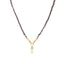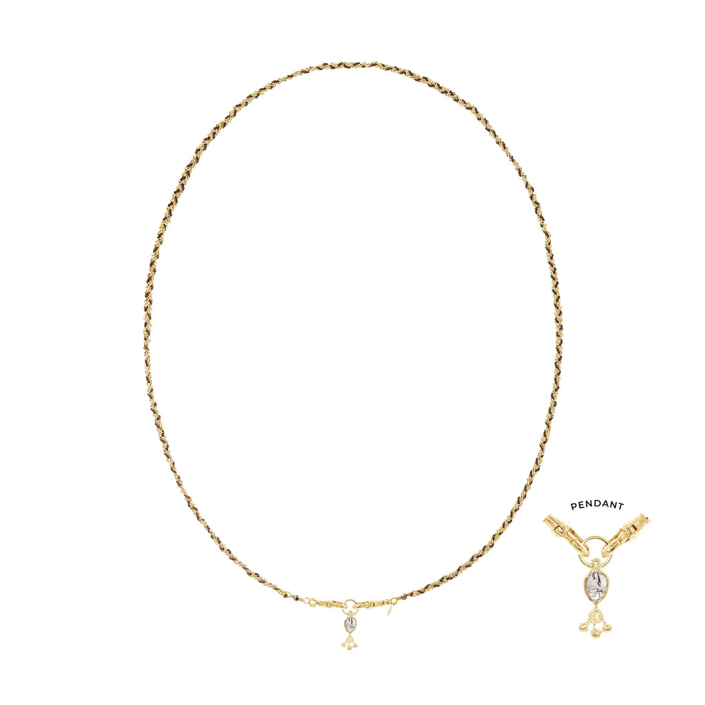 Necklace in 925 Sterling silver with a gold finish, featuring a braid of chains and brown silk yarns. It is adorned with a pendant set with a Polki diamond and three delicate mini bells. The necklace fastens with two lobster clasps, ensuring a secure and elegant fit.